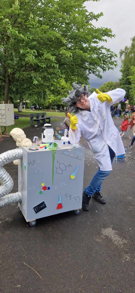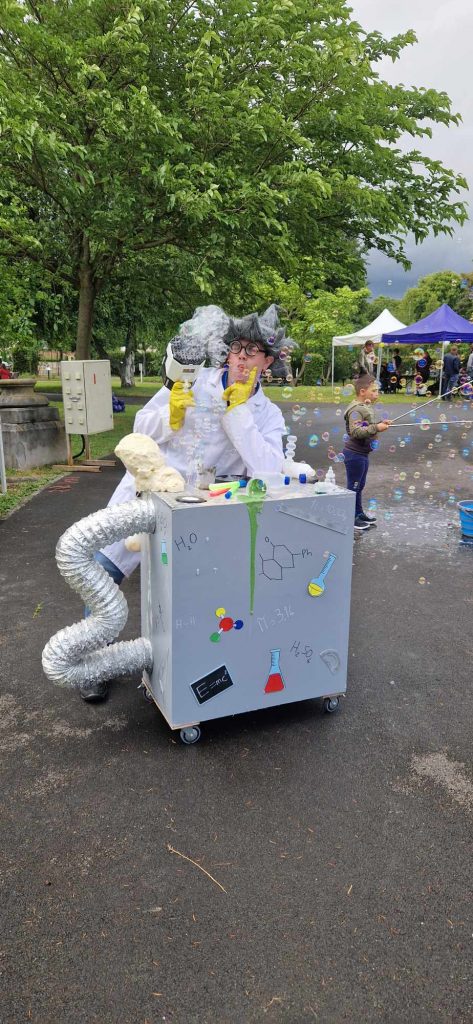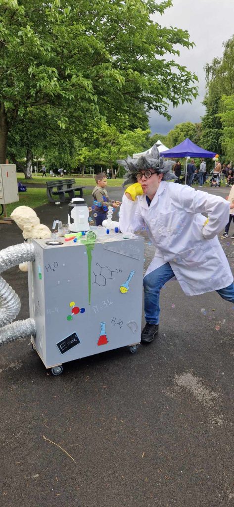 Venez découvrir le Labulatoire, le laboratoire ambulant des bulles géantes… ou plutôt, la machine à créer des sourires ! Cette animation est menée par le Professeur MaBulle (ou Ma Bubulle pour les intimes), titulaire d’un doctorat en bullologie et expert en éclats de rire. Ici, on regarde, on s’émerveille, on s’évade : bulles géantes ou myriades de petites bulles s’échappent du Labulatoire pour enchanter petits et grands. Mieux encore : vous pouvez essayer vous-même ! Sous l’œil (presque) attentif du Professeur, apprenez à créer vos propres bulles géantes et laissez-vous surprendre par la magie du savon et de l’air. Et surtout, venez rencontrer ce personnage complètement loufoque et déjanté, qui fait de chaque bulle un moment unique et mémorable. N’attendez plus : les bulles sont éphémères… et rappelez-vous : le feu ça brûle… mais le savon… ça bulle !